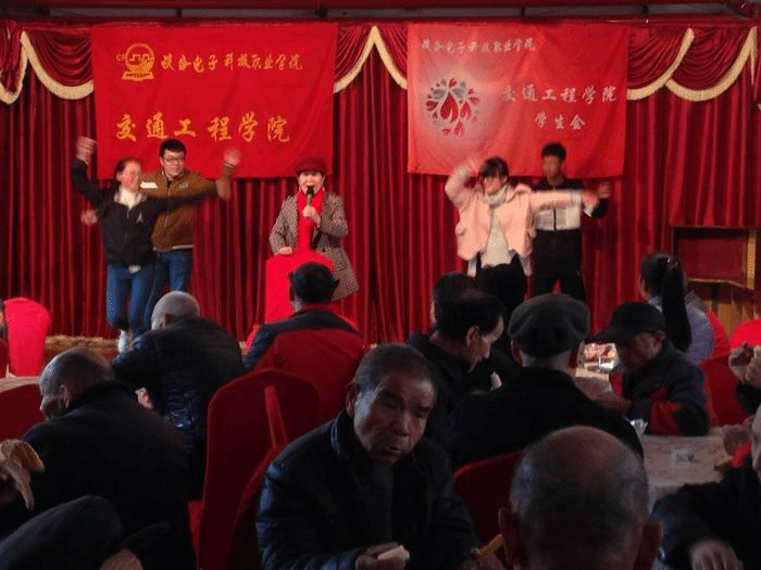 到达敬老院之后,同学们在团委副书记李敏和学生会主席郑皓尹、姜瑞龙的安排下将同学们精心准备好的小礼物分发给各位老人。在敬老院的会议大厅里同学们不仅将自己准备的精彩节目展现在敬老院的舞台上还和老人们一起高歌,一起鹊舞,整个敬老院上空都回荡着欢声笑语,老人们满面笑容,精神气更加爽朗。在活动过程中学生们与老人们交谈,听老人们诉说着他们的故事。