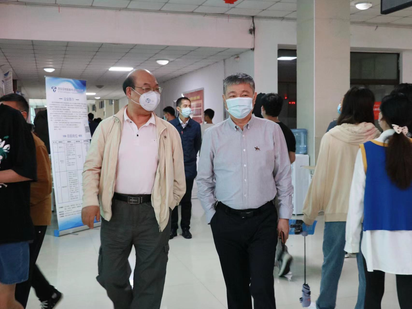 西安高新技术产业开发区创业中心部长王经纬、西安航天基地技创新与人才服务中心干部黄冬雪、部分联办高校就业工作负责人在学校校长张明教授、党委书记吴介军教授等学校领导的陪同下深入招聘会现场与用人单位和毕业生亲切交流,详细了解用人单位人才需求状况及毕业生求职情况。