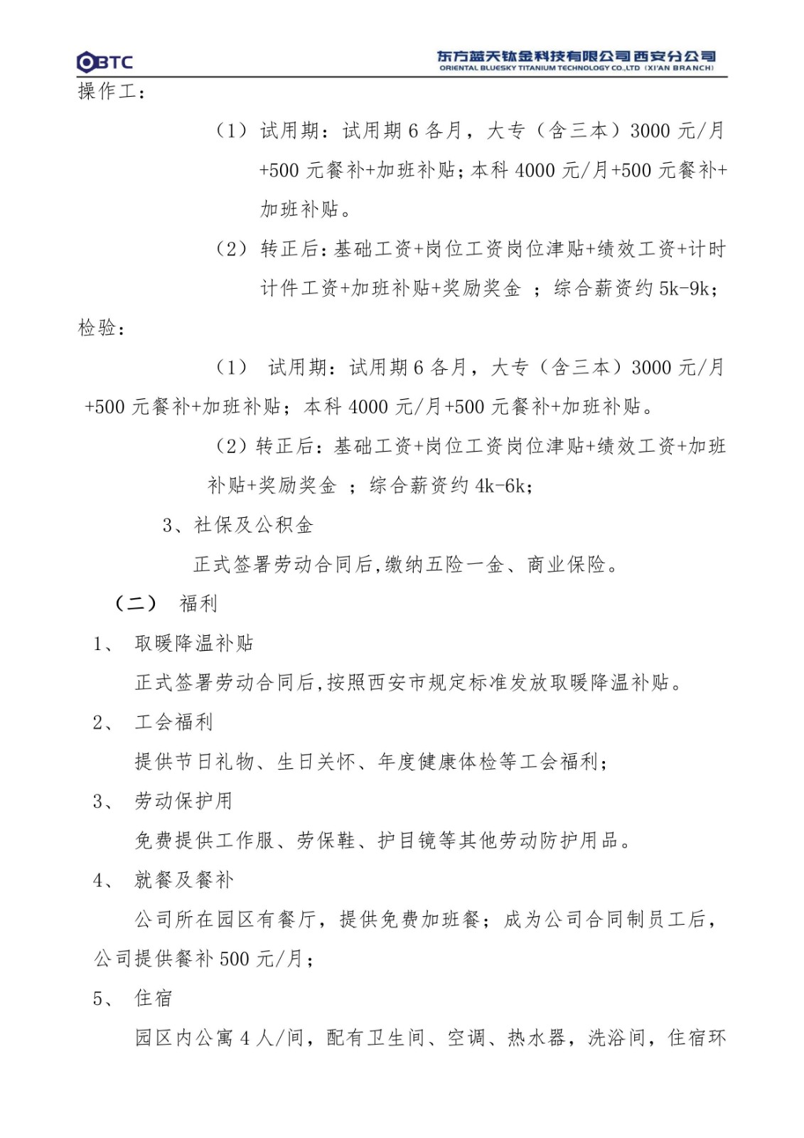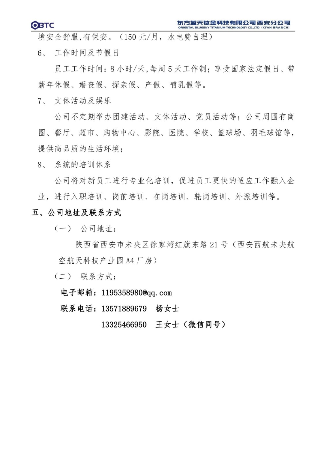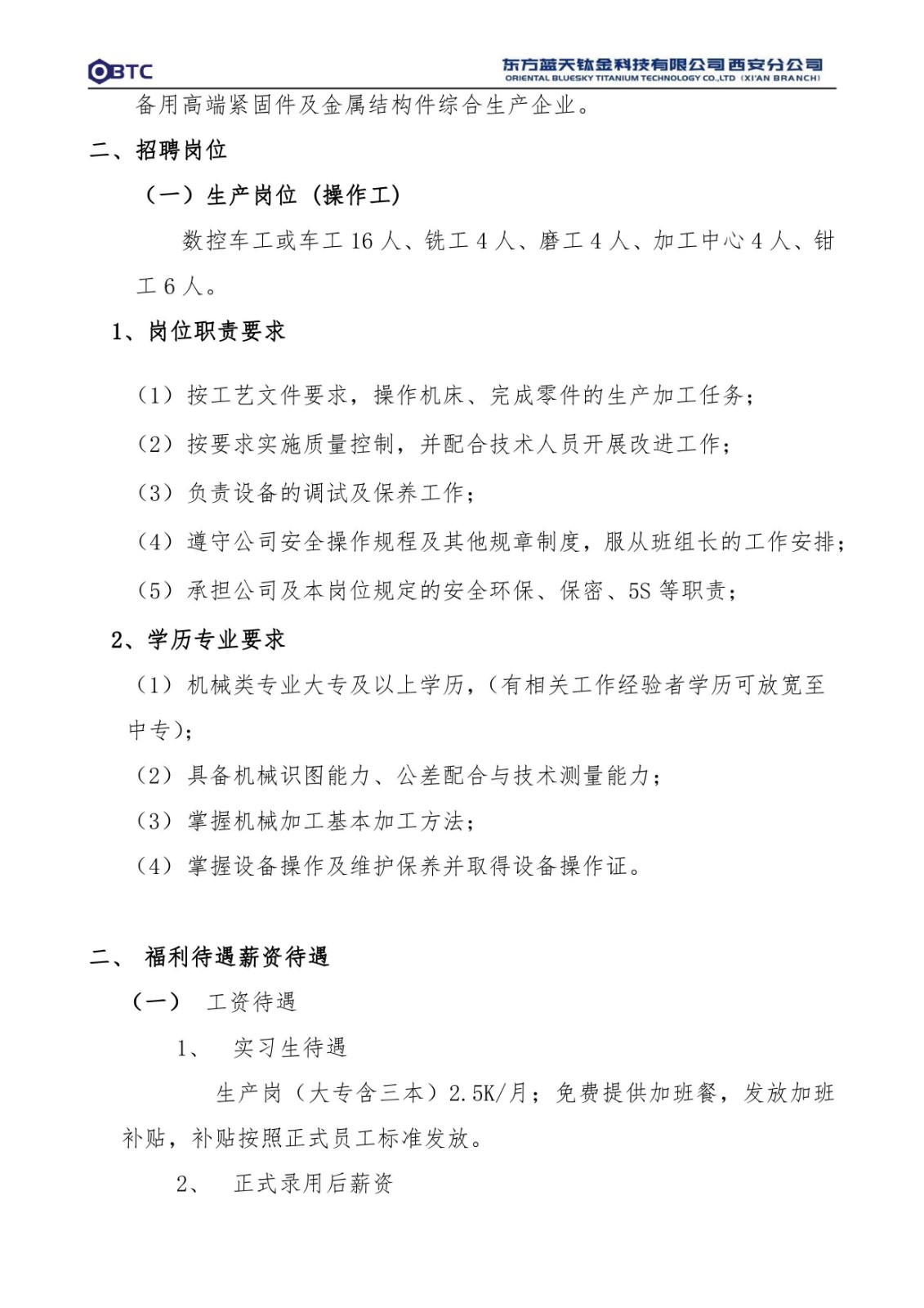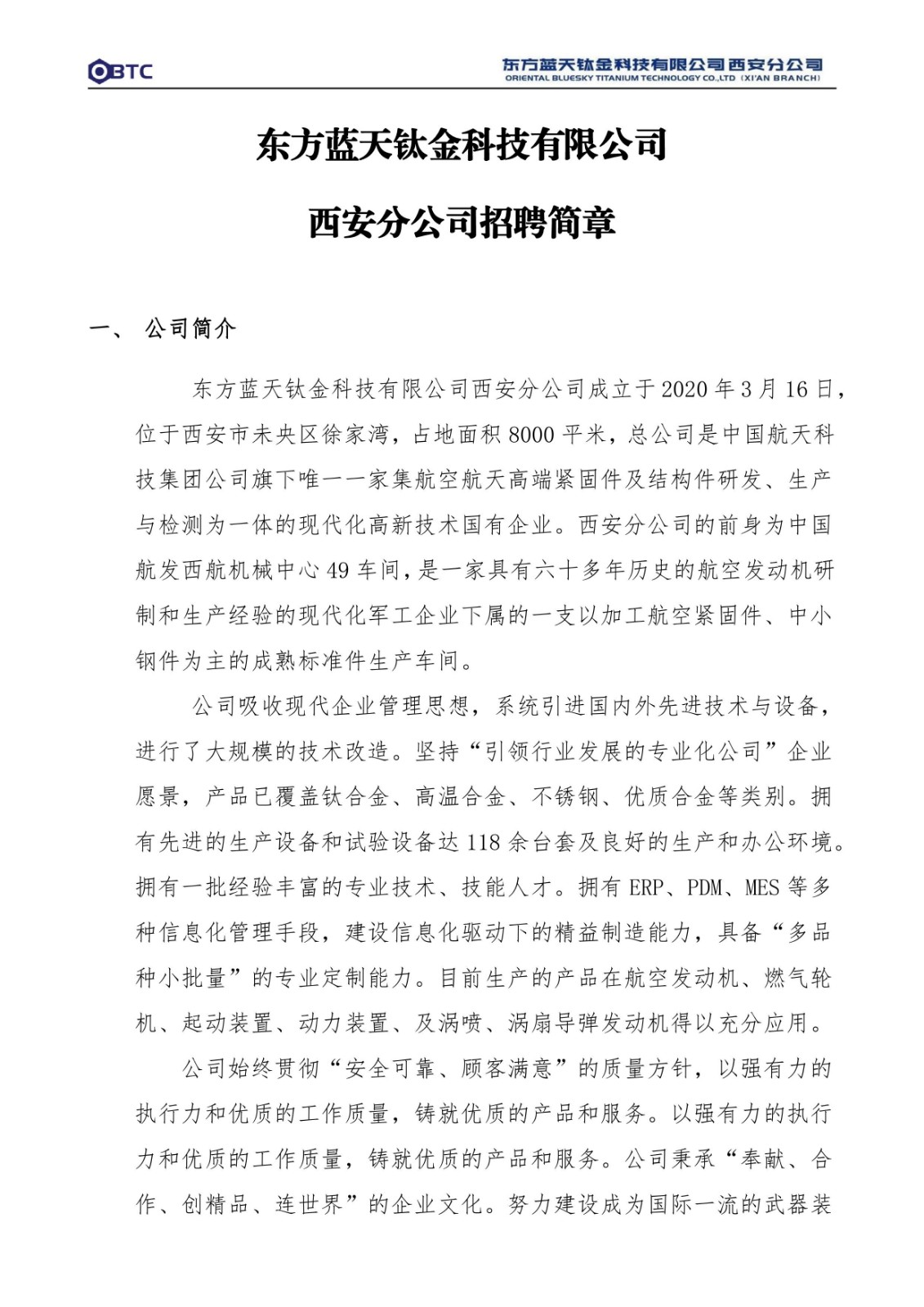 东方蓝天钛金科技有限公司西安分公司招聘简章