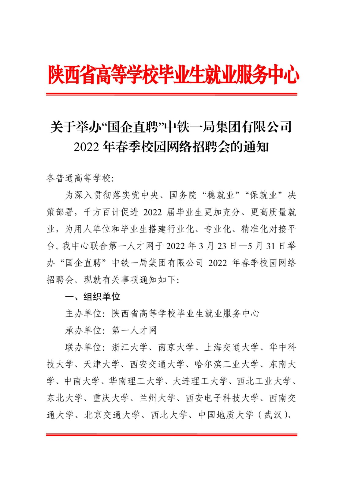 关于举办“国企直聘”中铁一局集团有限公司 2022 年春季校园网络招聘会的通知